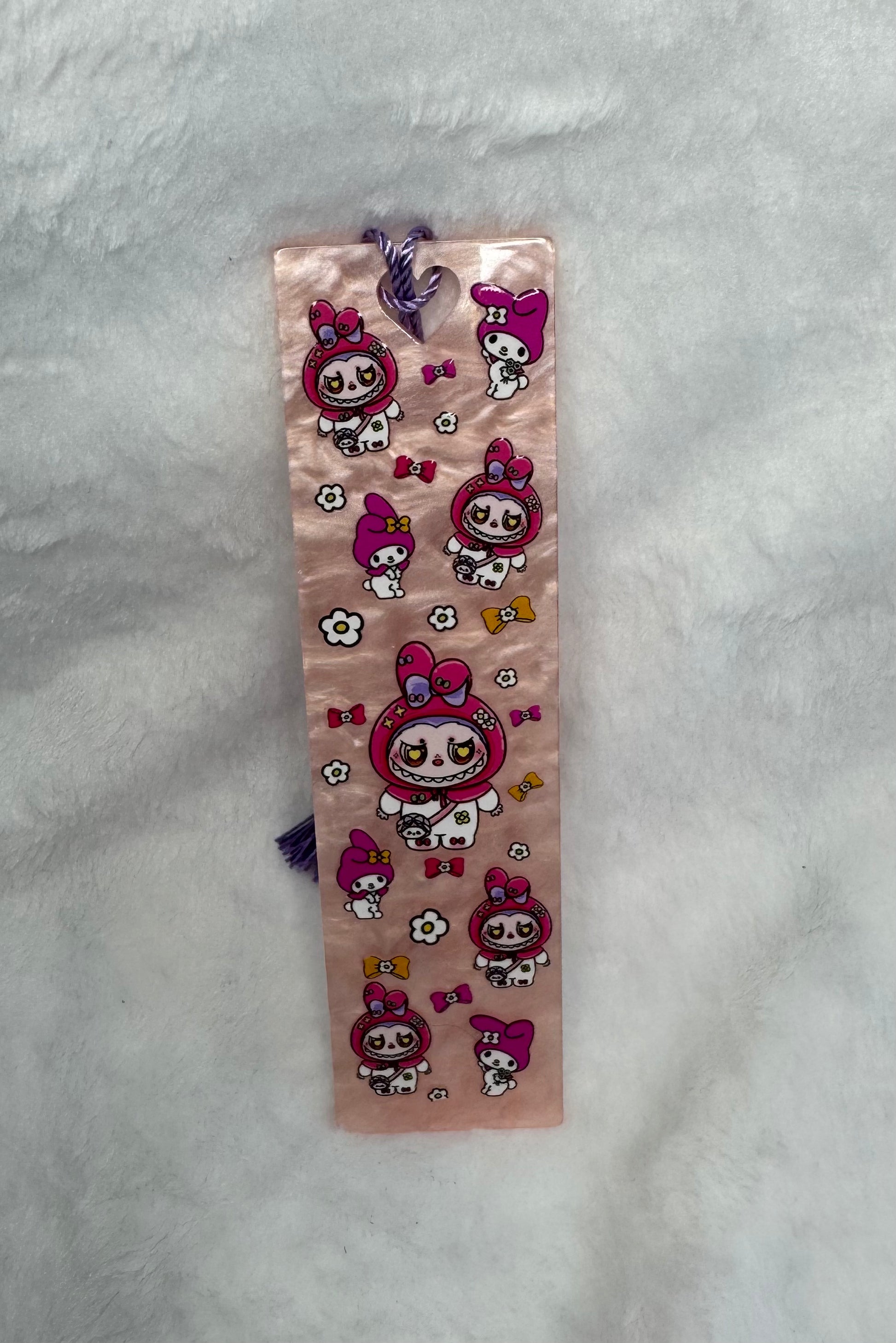 Pink My Melody and Labubu bookmark, with lavender tassel.