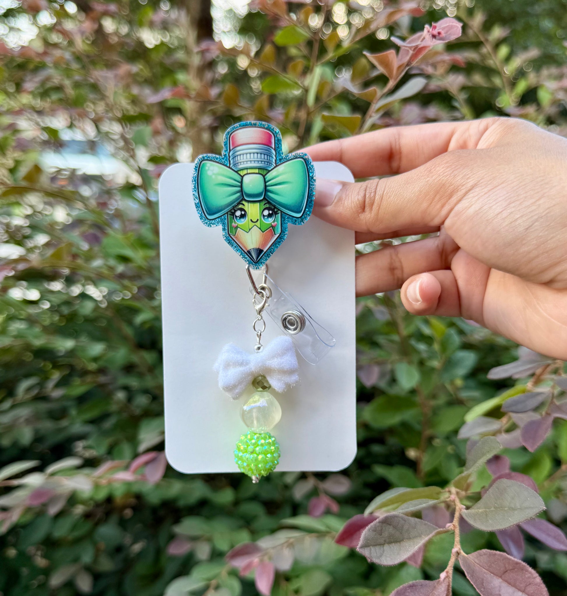 All badge reels can be customized to have beads as an accent feature upon request. Price will increase. $6 without beads and $10 with beads. All acrylics can be customized into a keychain upon request. Price without beads $6, with beads and tassel $8.